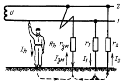 • Прикосновение к заземлённому проводу. Аварийный режим работы