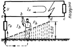 При коротком замыкании напряжение на заземлённом проводе может достигать опасных значений.
