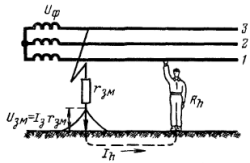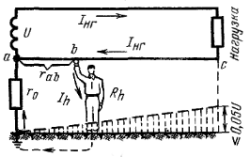 При замыкании провода на землю, человек прикоснувшийся к исправному проводу, оказывается под напряжением, равным почти полному напряжению линии, независимо от сопротивления изоляции проводов.