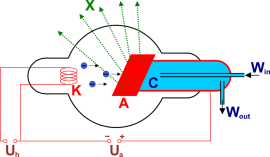 Схематическое изображение рентгеновской трубки. X — рентгеновские лучи, K — катод, А — анод (иногда называемый антикатодом), С — теплоотвод, Uh — напряжение накала катода, Ua — ускоряющее напряжение, Win — впуск водяного охлаждения, Wout — выпуск водяного охлаждения.