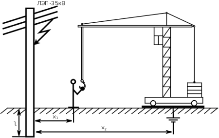 На строительной площадке, монтажник выполняя задание по установке башенного крана вблизи линий электропередач (ЛЭП), коснулся рукой крюка и был смертельно поражён электрическим током. Работа велась в дождливую ветреную погоду без оформления наряда - допуска. Кран был заземлён и стоял без электрической проводки. В это время на рядом расположенной опоре ЛЭП - 35 кВ от ветровой нагрузки и плохого состояния изоляционной подвески произошло замыкание фазного проводника на металлическую опору.