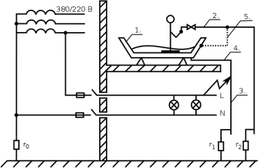В ванной комнате жилого дома произошло смертельное поражение человека электрическим током. Пострадавший (см. рис.), стоя в ванной (1) с небольшим количеством воды, взялся рукой за водопроводную трубу (2) и был поражён током. Электрическое напряжение возникло на сливном стояке (3) в результате повреждения изоляции фазного проводника L и контакта его со стояком в другом жилом помещении. Ванная и сливная труба (4) не имели контакта с водопроводной трубой (2), что и обусловило наличие напряжения между ванной (1) и трубой (2), которое воздействовало на пострадавшего.