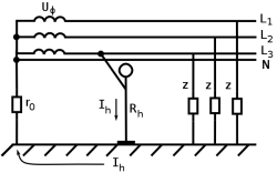 | Прикосновение человека к фазному проводу четырёхпроводной сети с заземлённой нейтралью. Нормальный режим работы сети. |
