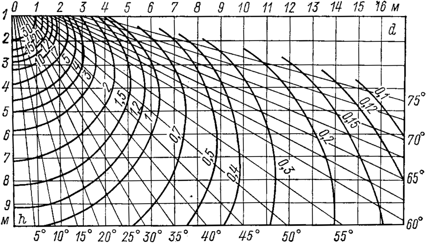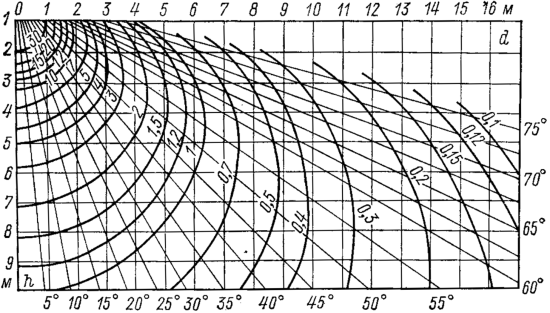 Для определения условной освещенности $е$ служат пространственные изолюксы условной горизонтальной освещенности источника света на которых находится точка с заданными $d$ и $h$.